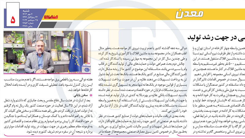 بخشی از مصاحبه روزنامه صمت (صنعت ، معدن و تجارت ) با مدیر عامل سدید ماشین افلاک که در مورخ 7-7-1403 منتشر شده است.
