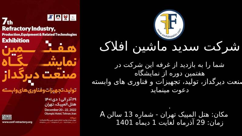 بر این مبنا، هفتمین دوره نمایشگاه صنعت دیرگداز، تولید، تجهیزات و فناوری های وابسته در تاریخ 29 آذر تا 1 دی ماه سال 1401 در هتل المپیک تهران برگزاری می گردد و شرکت سدید ماشین افلاک نیز، که حضور در رویدادهای نمایشگاهی را به عنوان یکی از استراتژیهای تعامل با ذینفعان خود برگزیده است، در این نمایشگاه حضور فعال خواهد داشت. میزبانی از شما بازدیدکنندگان بزرگوار باعث افتخار این مجموعه خواهد بود.
